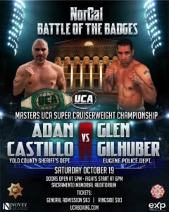 The newly crowned Masters UCA Super Cruiserweight Champion, Adan Castillo of the Yolo County Sheriff’s Department is set to make his first title defense against the 7-1 Glen Gilhuber from the Eugene, Oregon Police Department. This will be Glen’s second time competing in the NorCal Battle of the Badges, having previously defeated Ken Weckman of the CHP in 2016. Gilhuber continues to train under his longtime coach, Adam Cornelison, at Empire Boxing Club, and he’s making every day in the gym count.